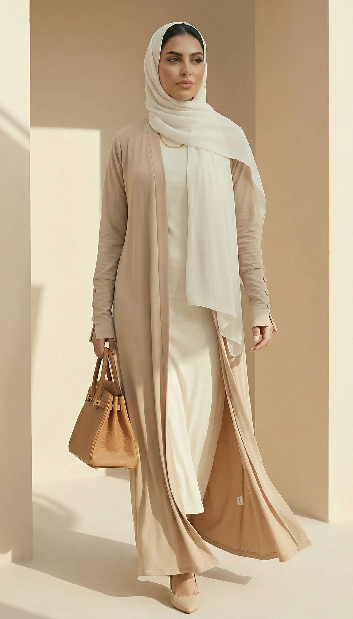 Crafted from premium Nida fabric—a luxurious blend that offers smooth, silky texture with elegant drape. This lightweight yet fully opaque material is perfect for Dubai's climate, providing breathable comfort throughout the day. Nida is naturally wrinkle-resistant and maintains its shape beautifully, ensuring you stay polished from morning to evening.