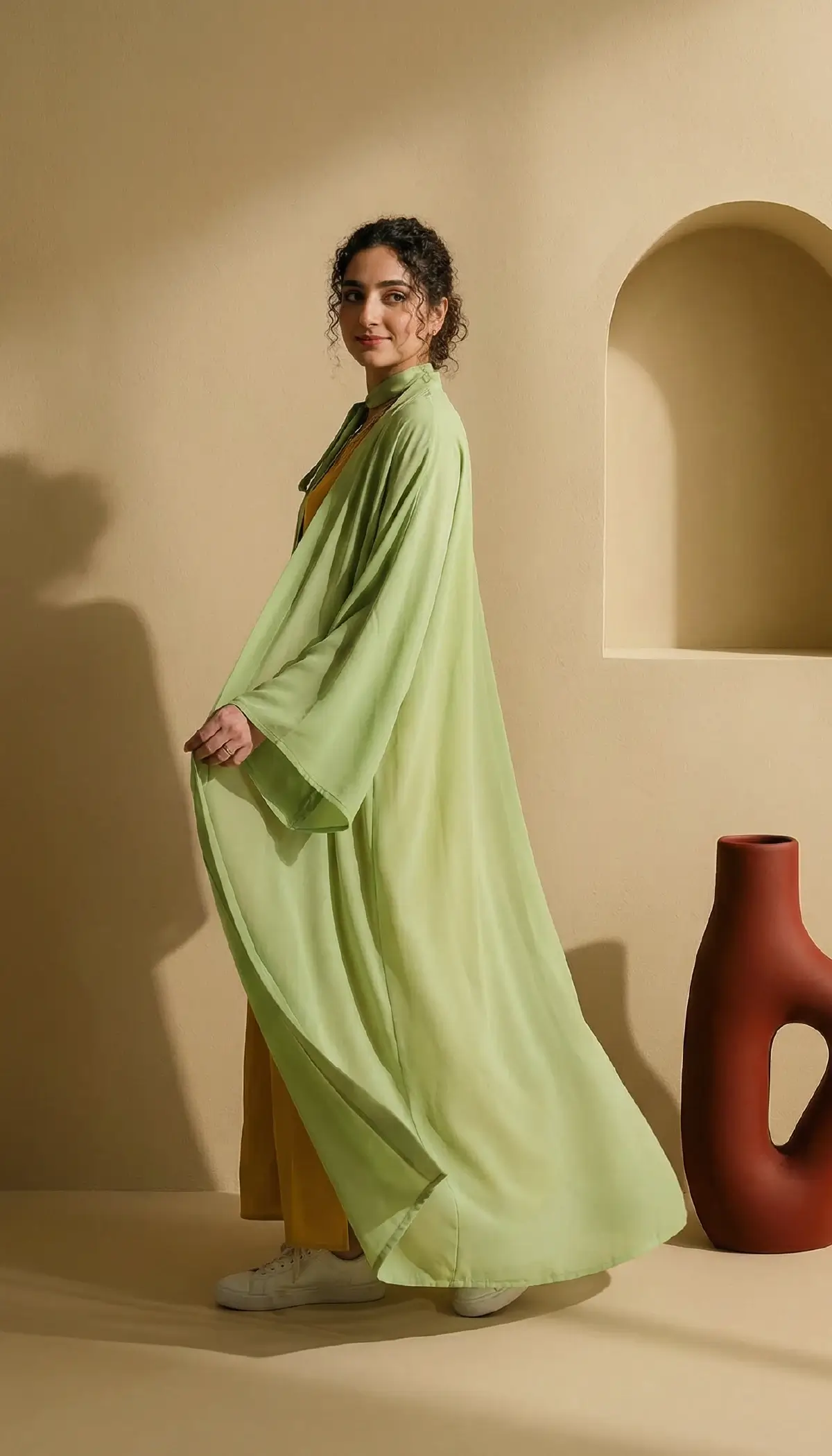 Each kimono begins with premium chiffon selected specifically for Dubai's climate—lightweight enough for outdoor wear, breathable for all-day comfort, yet substantial enough to create that signature kimono drape. The fresh pistachio green hue creates a sophisticated neutral that pairs effortlessly with everything in your closet. Layer this kimono over a mustard dress for creative office energy (as shown), throw it over jeans and a tee for elevated weekend style, or pair with tailored pants for modern modest clothing that commands attention. This is the ladies kimono that adapts to your real life, not the other way around.